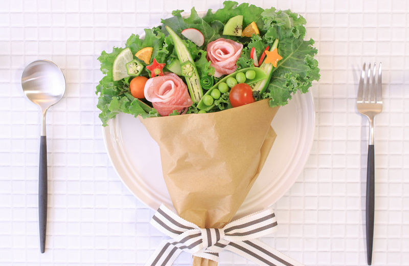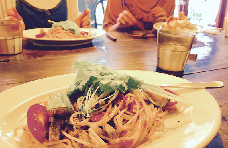 SNS投稿のためにランチをカフェで食べている。